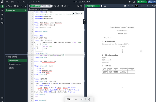 In einem 90-minütigen online-Workshop von Mareike Büscher, Lehrende der Fakultät Ingenieurwissenschaften und Informatik an der Hochschule Osnabrück, ging es am 21.10.2024 um eine Einführung in das Textsatzprogramm LaTeX. Frau Büscher zeigte auf, welche Möglichkeiten LaTeX im Vergleich zu Word, Writer und Co. bietet und wie LaTeX-Dokumente grundsätzlich aufgebaut sind. In Breakoutsessions konnten die Technikantinnen selbstständig auf der Plattform Overleaf ein erstes tex-Dokument setzen und probierten sich an Befehlen zu Tabellen, Nummerierungen, mathematischen Gleichungen und Gliederungen aus.